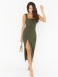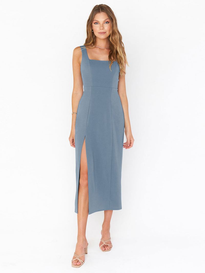 Casual Mouwloze Midi-jurk Met Split Voorkant Lage Vierkante Hals Dames