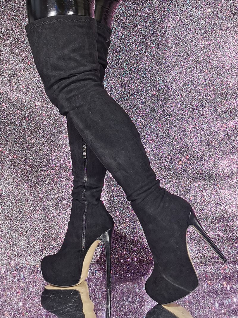 Dames Suède Dij Hoge Laarzen Sexy Zwarte Platform Hak Over Knie