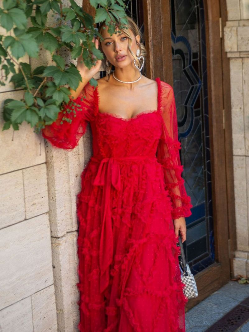 Damesjurk Met Ruches Illusie Mouwen Polka Dot Gelaagde Feestjurken