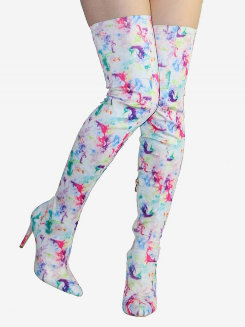 Dijhoge Laarzen Dames Puntige Neus Bedrukte Elastische Stof