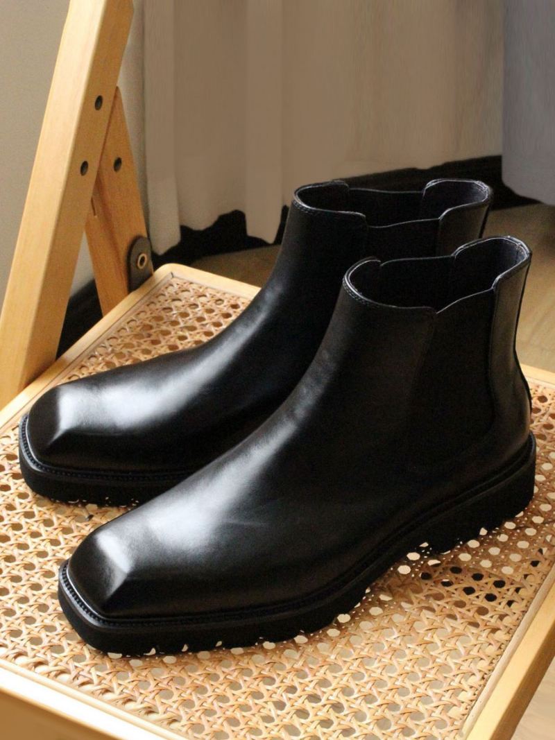 Herenlaarzen Chelsea-laarzen Zwarte Koeienhuid Feestschoenen Met Vierkante Neus