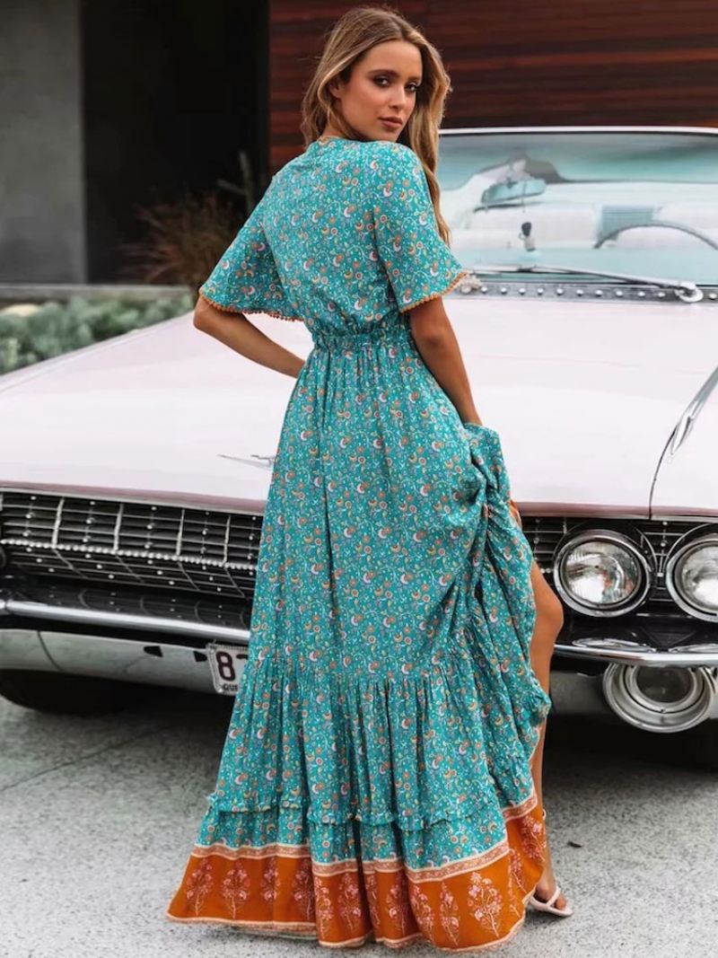 Maxi-jurk Dames Lange Jurk Met V-hals Korte Mouwen Print