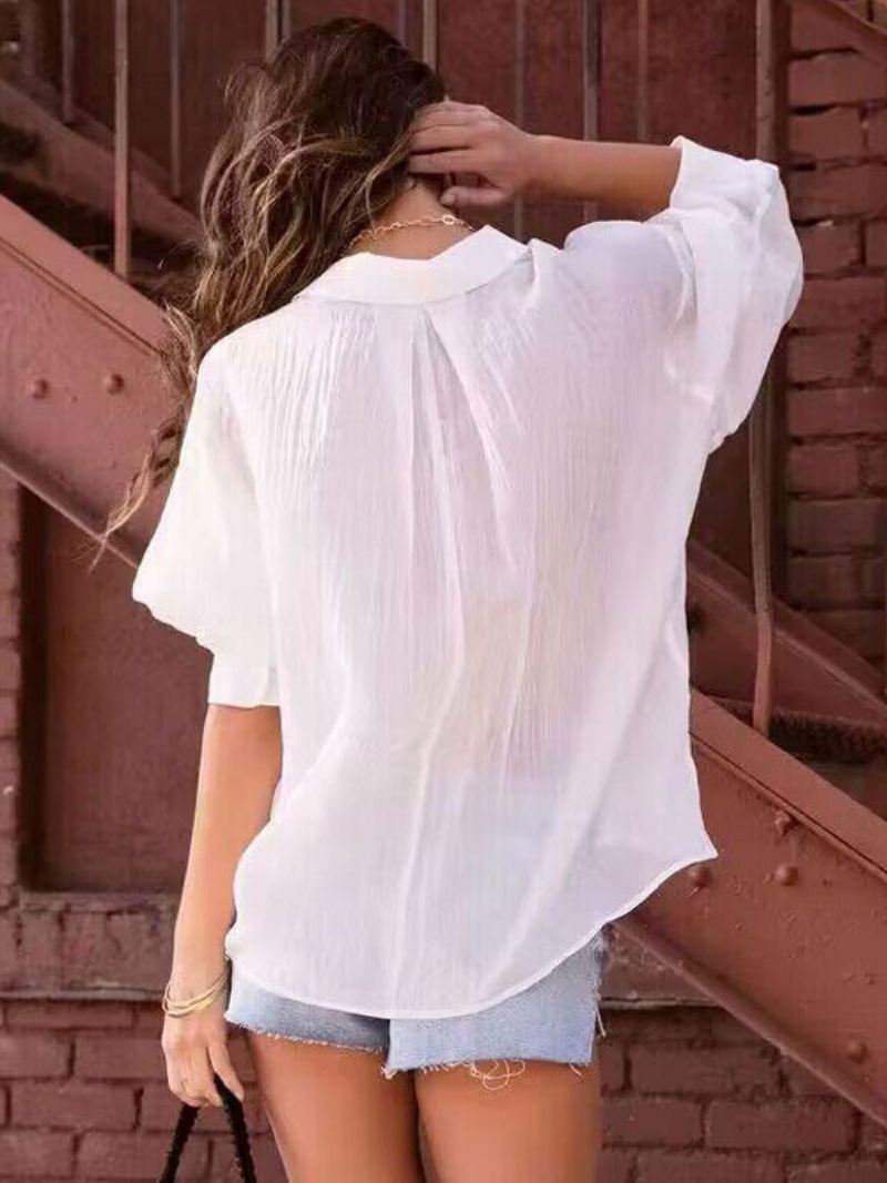 Shirt Dames Wit Oversized Geplooide Kraag Casual Tops Met Lange Mouwen