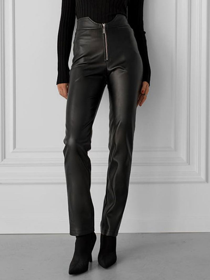 Zwarte Pu-leren Broek Met Verhoogde Taille Ritssluiting Dames